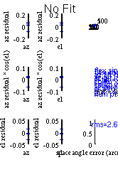There was a problem calculating the pointingMeasured pointing crosses on 1 sources Offsets in Arcminutes Source Az: El: Azoff: Eloff: Sky_Off: M42 128.6 30.9 +0.48 -2.02 2.06 TauA 222.1 68.7 +3.22 -0.62 3.03 M42 202.1 43.2 -6.23 -0.40 4.57 CygA 70.9 59.0 +1.74 0.63 1.49 Pointing model residuals on these sources is 2.26 arcmin Pointing model residuals low: model still good