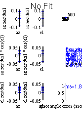 There was a problem calculating the pointingMeasured pointing crosses on 1 sources Offsets in Arcminutes Source Az: El: Azoff: Eloff: Sky_Off: CasA 320.8 51.3 -3.87 1.44 2.31 TauA 99.1 47.7 +1.84 1.84 2.42 M42 127.5 30.1 +0.42 -0.21 0.22 TauA 219.2 69.4 +4.39 -0.42 4.29 M42 200.5 43.6 +0.37 0.95 1.01 CygA 71.6 64.6 +3.23 0.54 0.84 CygA 287.3 67.3 -0.43 0.20 0.22 CasA 26.3 62.2 -5.85 1.30 4.97 Pointing model residuals on these sources is 1.60 arcmin Pointing model residuals low: model still good
